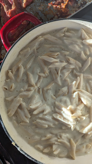 °To the same pot, make a roux with the butter and flour: melt the butter on medium heat then whisk in the flour simply to cook it for a few minutes. To that add the milk, Dijion, and seasoning - whisking till thickened.